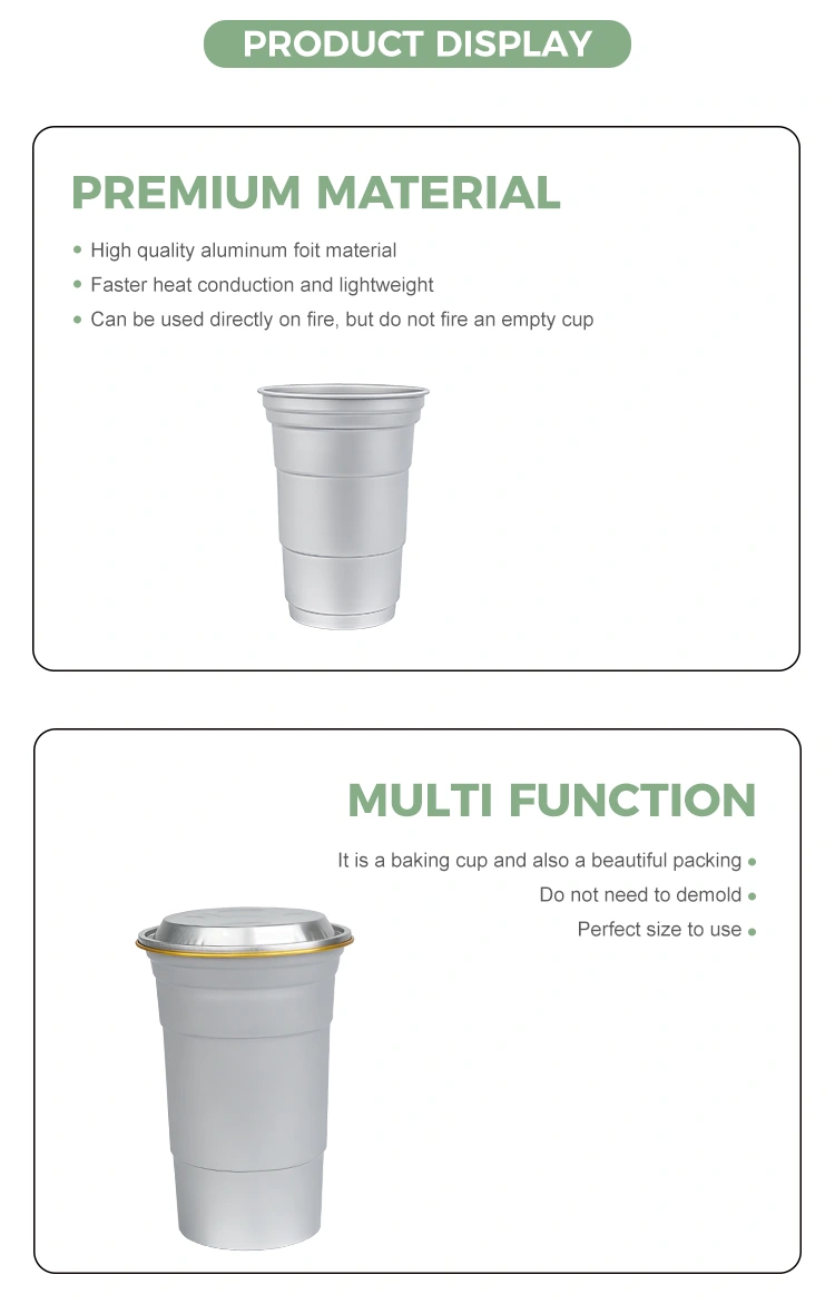 뜨거운 음료를 보관하는 데에도 사용할 수 있습니다. 16온스 일회용 맞춤형 알루미늄 호일 뜨거운 음료 컵 자체를 오븐에 넣어 가열하거나 캠프파이어(빈 컵이 불꽃과 직접 접촉하지 않도록 주의)에 넣어 내용물을 가열할 수 있습니다.