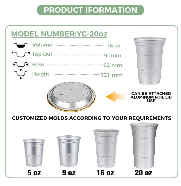 Yunchu는 중국 최고의 16oz 일회용 맞춤형 알루미늄 호일 음료 컵 제조업체입니다. 이 16온스 일회용 맞춤형 알루미늄 호일 마시는 컵은 커피, 맥주와 같은 표준 음료에 적합한 460밀리리터 알루미늄 호일 컵입니다. 표준화된 디자인이 특징이며 주로 맞춤화가 자주 필요한 커피숍, 공예 바와 같은 상업용 사용자를 대상으로 합니다. 효율적인 열 전도와 기본 밀봉 성능을 제공하는 동시에 이 16온스 일회용 맞춤형 재활용 알루미늄 호일 음료 컵은 빠르고 유연한 브랜드 시각적 맞춤 서비스에 더 중점을 둡니다.