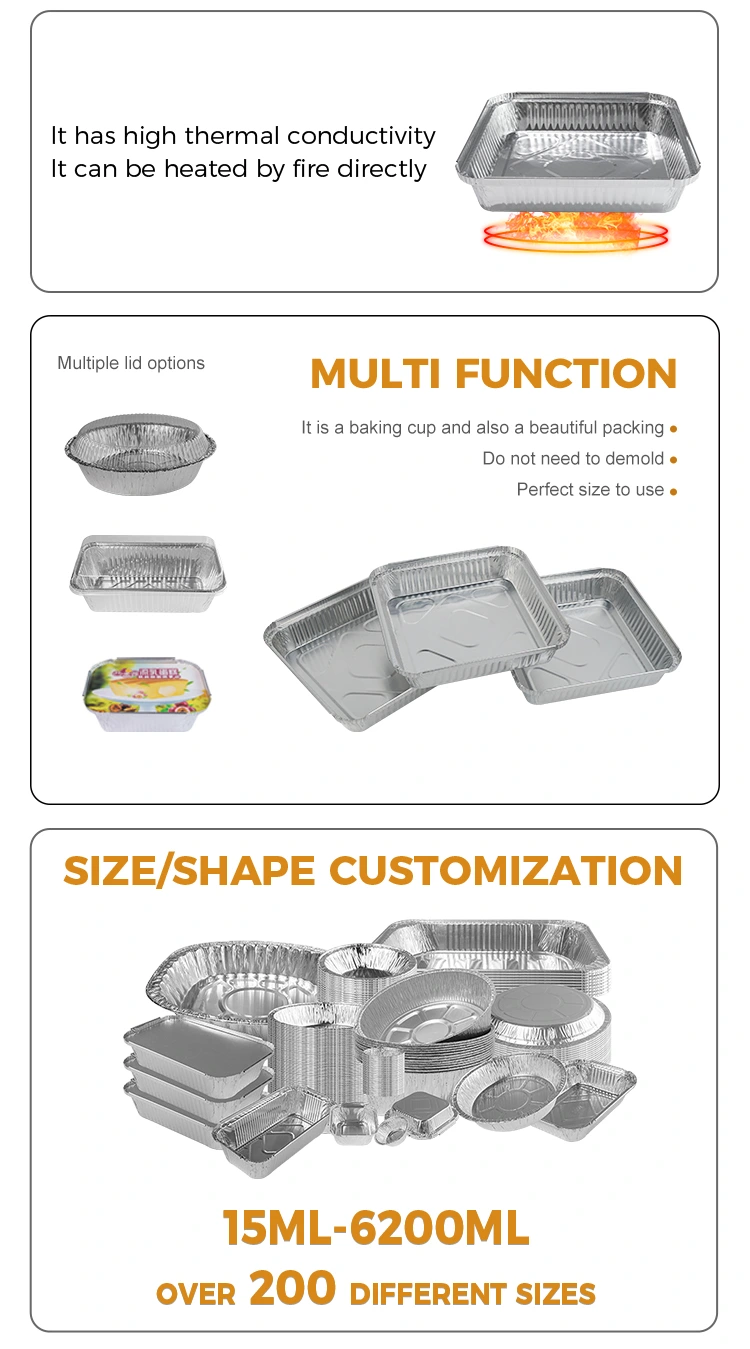 Yunchu 알루미늄 호일 공급 업체는 일회용 바베큐 꼬치 실버 알루미늄 호일 용기를 생산하며, 테이크 아웃 주문, 빵집의 작은 케이크, 가족 간식 및 레스토랑에 적합합니다. 안전하고 건강하고 음식 아이디어는 제한적이지 않으며, 주방기구는 음식을 쉽게 요리하는 좋은 파트너이며, 에어 프라이어 및 기타 장비는 열 저항력이 있고 석유 방지, 야외 바베큐, 야외 바베큐, 임시 그릇은 화재를 두려워하지 않습니다. 음식이나 수프를 배치해야 할 때, 물을 놓아야 할 때, 가구를 건조시키지 않고, 깨끗하고 편리하지 않으면, 컨테이션 할 수 있습니다. 테두리 디자인은 손을 긁는 것을 피하기 위해 사려 깊습니다. 다양한 사용 시나리오에 맞게 여러 크기를 선택할 수 있습니다. 궁금한 점이 있거나 자세한 정보가 필요하면 언제든지 문의하십시오.