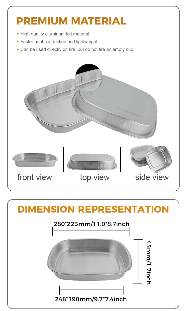 4. 테이크아웃 사각 슬라이버 알루미늄 호일 푸드 팬은 심플하고 깔끔한 라인을 채택하고 모던한 실버 광택으로 보완되었습니다. 이는 음식의 시각적 매력과 전반적인 품질을 향상시켜 브랜드의 전문적이고 고급스러운 이미지를 강화하는 데 도움이 됩니다.