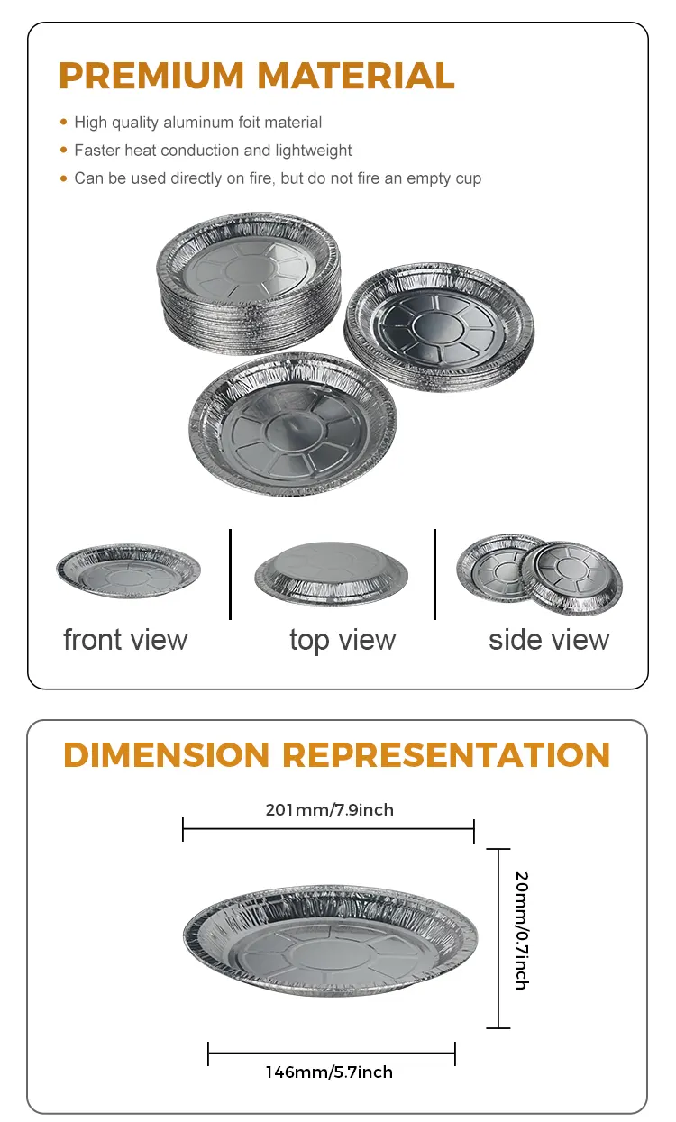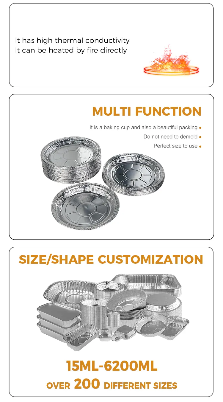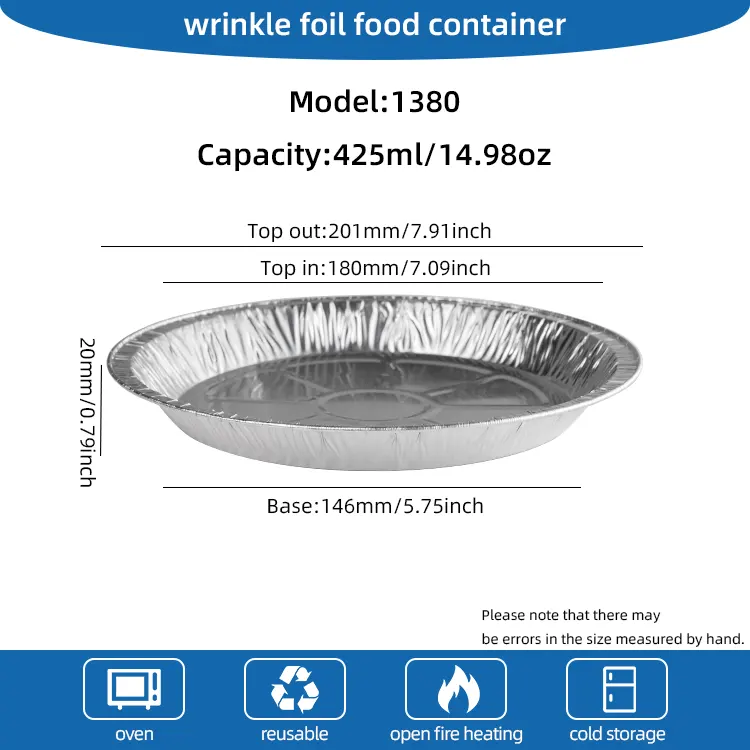 Yunchu 알루미늄 호일 일회용 디스크 에어 프라이어 실버 알루미늄 호일 용기는 위생적이고 환경 친화적입니다. 쉽게 변형되지 않고 식품에 직접 닿을 수 있도록 두껍고 부식에 강한 소재로 제작되었습니다. 고온을 두려워하지 않고 타지 않으며 타지 않으며 버리는 것이 쉽지 않습니다. 최대 250°C의 고온에도 견딜 수 있으며 고온 베이킹, 오븐, 바비큐 등 다양한 조리 방법에 적합하므로 걱정할 필요가 없습니다. 다양한 크기의 다양한 베이킹 요구 사항을 충족하기 위해 다양한 사양을 사용할 수 있으므로 다양한 식품 생산 요구 사항에 쉽게 대처할 수 있습니다.