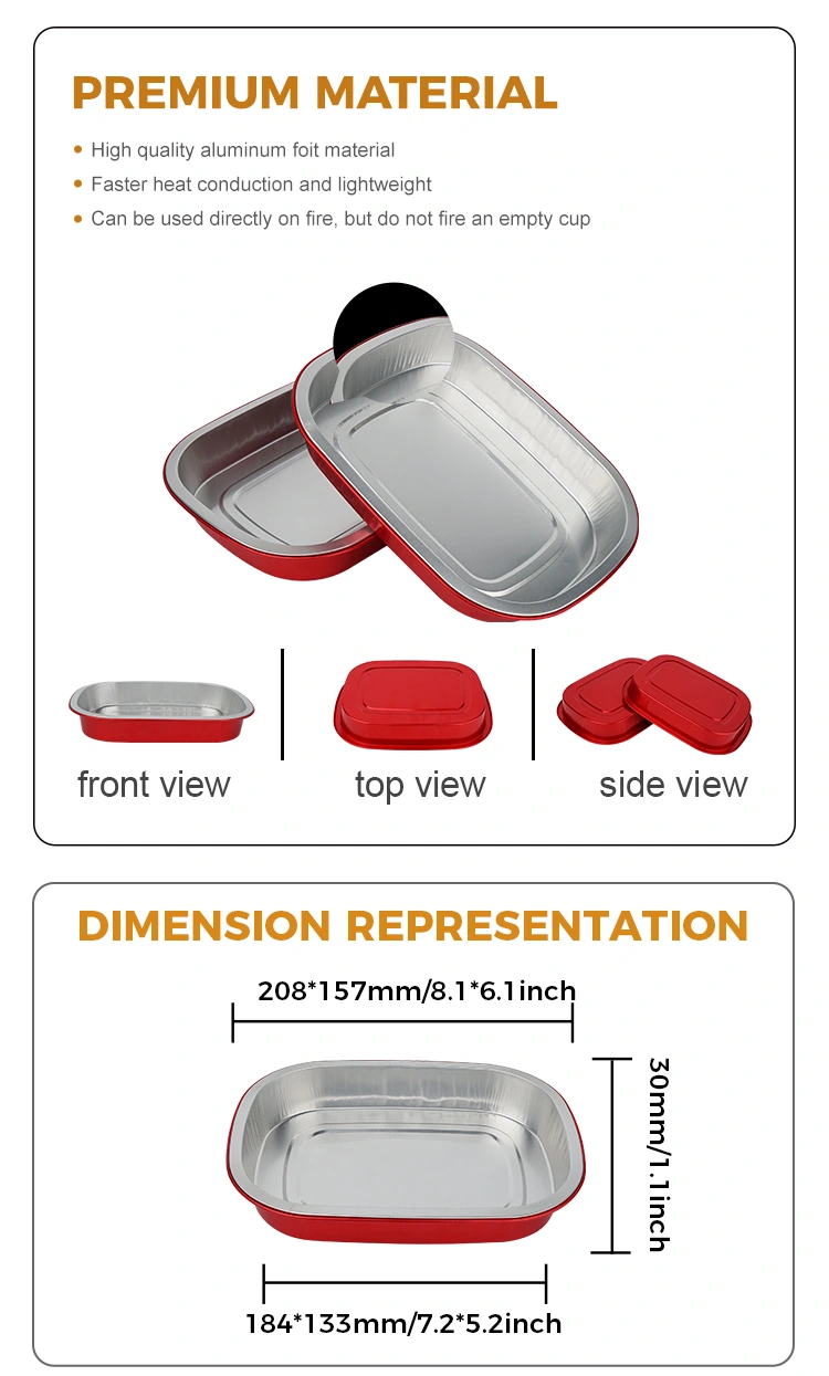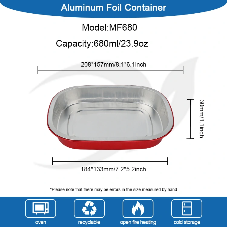 Yunchu는 중국의 알루미늄 호일 용기 전문 제조 및 공급업체입니다. 우리가 제공하는 일회용 빨간색 도시락 상자 알루미늄 호일 용기의 직경은 208*157mm(8.1*6.1인치)입니다. 하단 직경은 184*133(7.2*5.2인치), 높이는 30(1.1인치), 용량은 약 680밀리리터(23.9OZ)입니다. 인성과 내하력을 모두 고려한 식품 등급 8011 식품 등급 알루미늄 호일 두꺼운 기본 재료를 채택하고 변형이나 누출이 쉽지 않으며 식품을 직접 지지할 수 있습니다. -20℃ ~ 220℃의 매우 넓은 온도 범위와 호환됩니다. 탈형이 필요하지 않습니다. 오븐이나 에어프라이어, 찜기에 직접 넣어서 사용할 수도 있고, 냉장보관하여 보관할 수도 있습니다. "베이킹-보관-소비-폐기"까지 원스톱으로 편리한 경험을 제공합니다. 알루미늄 호일의 핵심 장점은 높은 열전도율입니다. 황금색 코팅은 열을 모으는 데 도움이 되어 음식이 고르고 빠르게 가열되도록 합니다.
