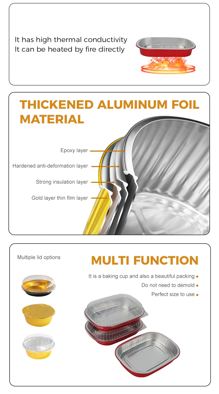 쿠키와 에그 타르트를 굽는 초보 베이커이든 파스타와 통생선을 굽는 고급 플레이어이든 관계없이 일회용 빨간색 도시락 상자 알루미늄 호일 용기는 완벽하게 적용할 수 있습니다. 미리 오일을 브러싱할 필요가 없습니다. 재료를 베이킹에 직접 넣을 수 있습니다. 오븐에서 나온 후 접시에 직접 담을 수 있어 베이킹 트레이를 떼어내고 청소하는 수고가 필요하지 않습니다. 황금색 외관은 구운 식품을 더욱 정교하게 만듭니다. 축제 기간 동안 황금색 베이킹 트레이에 크랜베리 ​​쿠키와 로스트 치킨을 굽는 순간 재회의 분위기가 고조됩니다. 사진을 찍어 소셜 미디어 플랫폼에 공유하면 매우 눈길을 끌 것입니다.