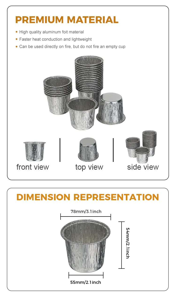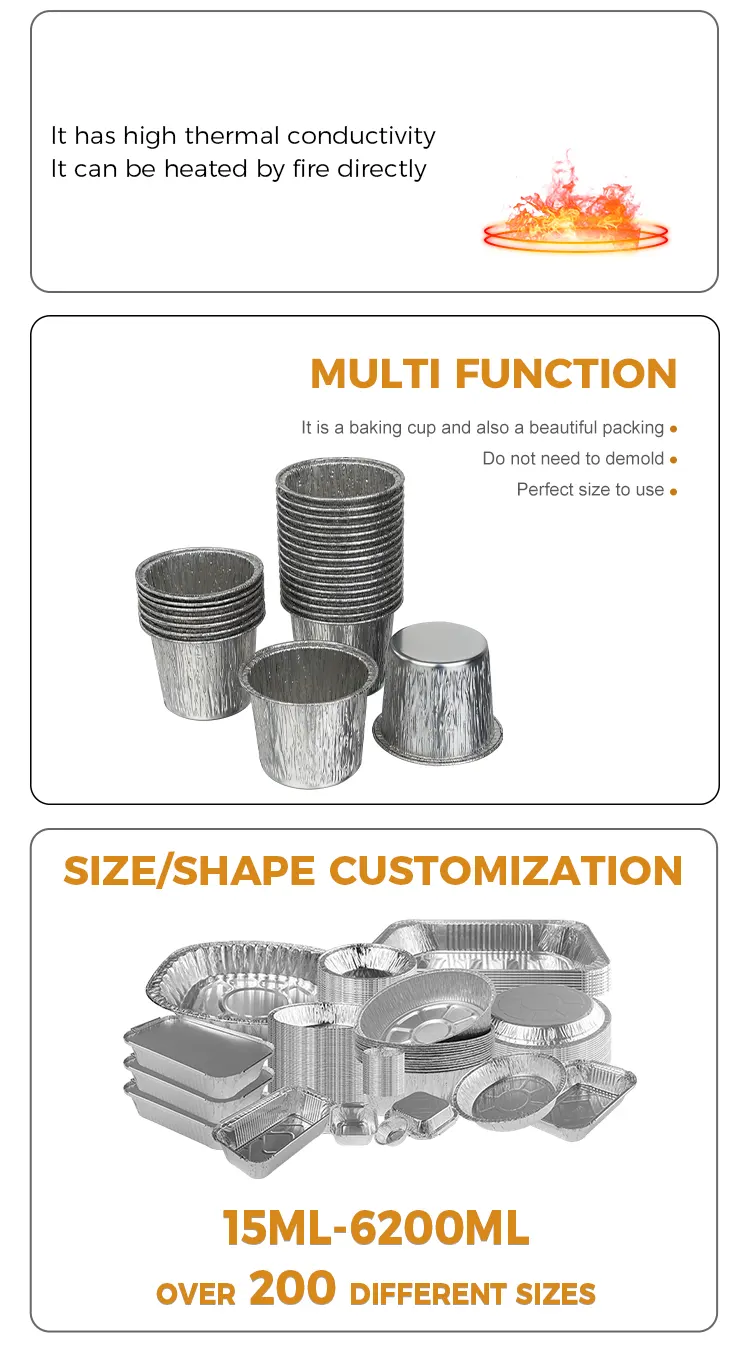 Yunchu 알루미늄 호일 제조업체의 일회용 원형 케이크 컵 은색 알루미늄 호일 용기는 일회용 및 일회용으로 설계되어 금형 청소 문제를 완전히 제거합니다. 홈베이킹 후 청소 및 마무리 작업이든, 상업용 식사의 효율적인 회전이든, 시간과 비용을 크게 절약할 수 있습니다. 편의성과 위생을 고려하여 많은 사람들과 곰팡이를 공유하는 위생 위험을 피하기 위해 파티, 결혼식, 애프터눈 티 모임 및 기타 장면에 특히 적합합니다. 동시에 알루미늄 호일 소재는 재활용이 가능하고 환경 보호 개념을 준수하며 사용하기 편리하면서도 환경을 보호합니다.