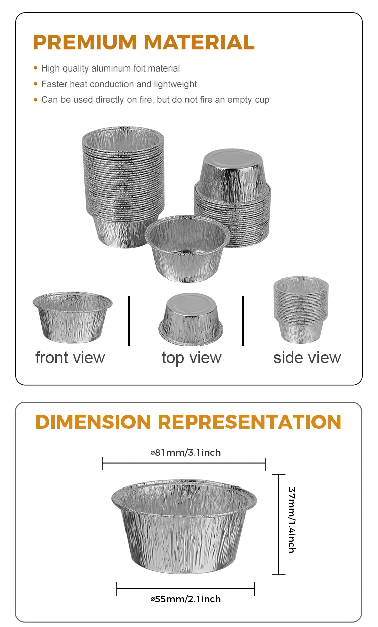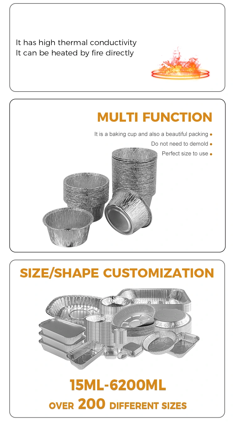 Yunchu 알루미늄 호일 제조업체는 둥근 베이킹 컵 디자인을 채택하고 바닥에 홈이 있어 안정적으로 세워지고 미끄럼 방지 효과가 있는 일회용 원형 케이크 트레이 실버 알루미늄 호일 용기를 출시했습니다. 이 용기는 청소할 필요가 없고 사용 후 버릴 수 있어 편리하고 빠릅니다. 열전도가 빠르고, 쉽게 타지 않고 바닥에 달라붙지 않으며, 엣지있는 디자인을 갖추고 있습니다. 두꺼운 소재로 만들어져 견고하고 내구성이 뛰어나며 쉽게 손상되지 않으며 내유성 및 얼룩 방지 기능이 있으며 쉽게 탈형할 수 있습니다.