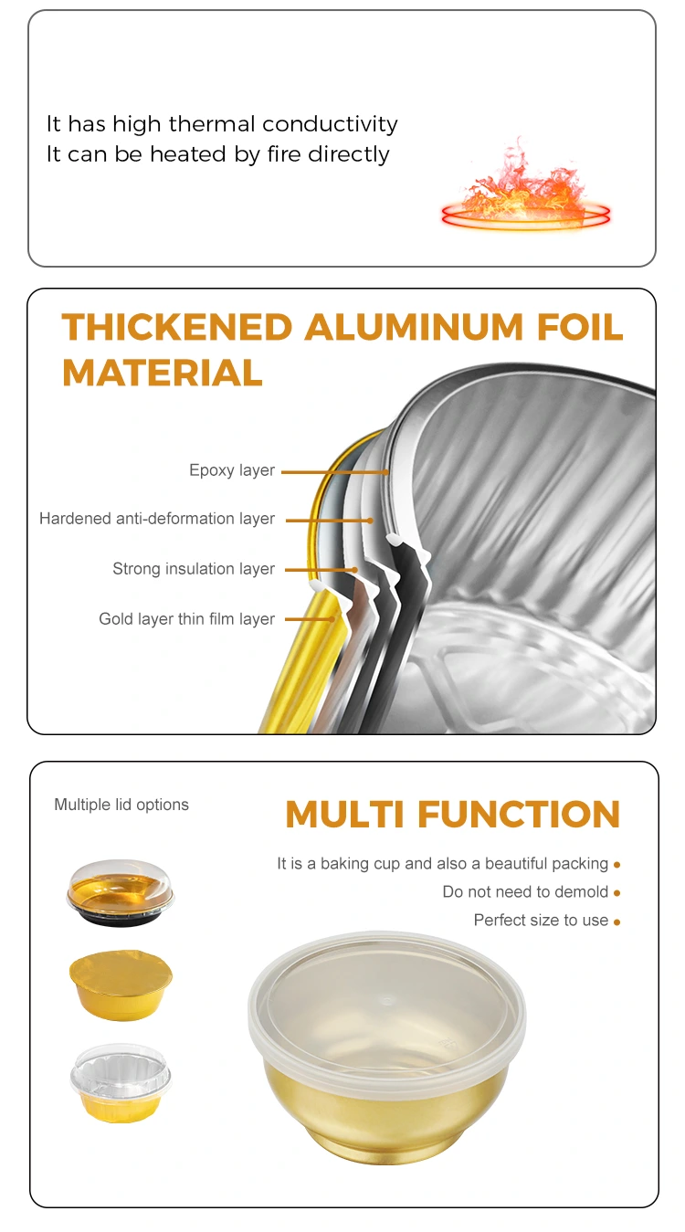 Yunchu 알루미늄 호일 공급 업체, 일회용 둥근 작은 금 그릇 알루미늄 호일 용기, 두꺼운 알루미늄 호일, 높은 경도, 쉽게 변형되지 않음, 누출없이 밀봉 가능, 강한 내열성, 재사용 가능, 금형 및 포장 역할 모두, 고온 살균 알루미늄 호일 포장은 안전하고 위생적이며 우수한 단열 특성 (강한 내열성)을 가질 수 있습니다. 찌고, 냉장하고, 냉동하고 재활용이 가능합니다. 식품 등급 PE 내부 막, 식품 등급 PE 내부 막과 결합된 금속 재료, 무색 및 무취의 두꺼운 병 본체는 작은 병이 쉽게 변형되지 않도록 하여 우수한 보호, 강력한 밀봉 안전성 및 신뢰성을 제공합니다. 병 뚜껑은 병 본체와 단단히 결합되며 강력한 밀봉은 제품의 신선도를 오랫동안 유지하며 안전하고 환경 친화적이며 무취인 완전히 새로운 재료입니다. 일회용 둥근 작은 금 그릇 알루미늄 호일 용기는 식품 공장, 사탕 공장, 말린 과일 공장, 빵집, 전문 식품 상점 및 말린 과일 분류 상점 등과 같은 다양한 식품 산업에서 널리 사용됩니다. 식품, 사탕, 꿀, 말린 자두, 말린 과일, 숙성된 귤 껍질, 고체, 액체 및 고체 에센스를 담는 데 사용됩니다.