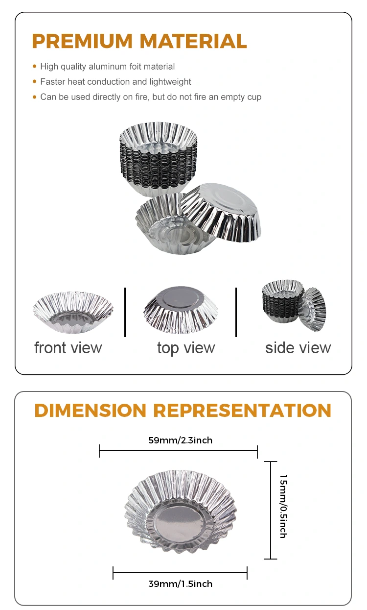 Yunchu 알루미늄 에그 타르트 토스트 베이킹  에그 타르트 및 기타 디저트용으로 설계된 실버 알루미늄 호일 식품 용기 제품 도매입니다. 안전하고 무독성이며 열전도율이 좋은 식품 등급 알루미늄 호일로 만들어져 베이킹 과정에서 음식이 고르게 가열되고 더 나은 맛을 보장합니다. 이 에그 타르트 트레이는 다목적이며 가족 모임, 비즈니스 이벤트 등 다양한 행사에 적합합니다. 사용 시 고온에서 곰팡이 제거가 쉽고 완제품이 완성된 후 필름 제거가 쉽고 바닥이 달라붙지 않으며 모양이 손상되지 않으며 변형하기 쉽지 않은 재료를 두껍고 단단하게 하고 압력 저항이 좋으며 냄비 세척 문제에 작별 인사하고 냄비를 쉽게 보호하고 사용 후 청소하지 않고 기름 얼룩을 분리하고 바닥이 매끄럽지 않습니다. 바닥이 타서 달라붙지 않으며, 붙지 않는 음식은 조리가 쉽고, 바닥이 매끄러우며, -20°C~300°C에도 견딜 수 있고, 화염에 가열할 수 있으며, 몰드가 고르게 가열됩니다.