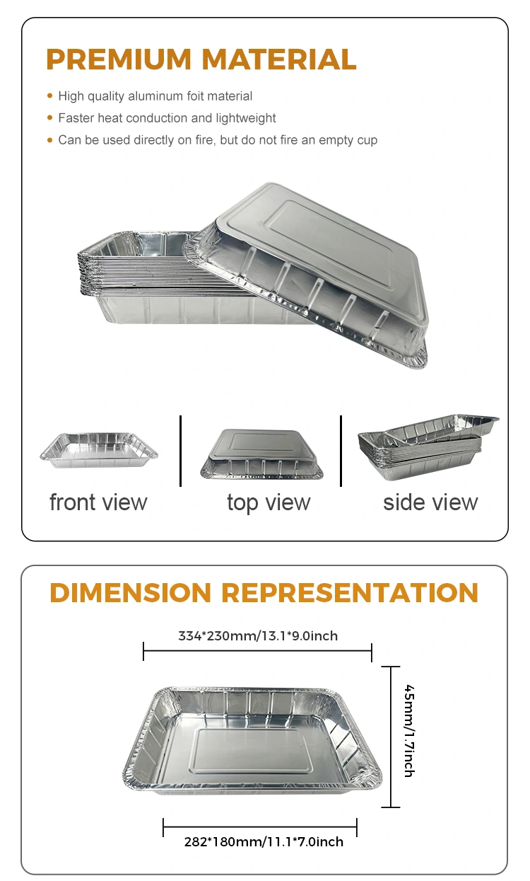 Yunchu 알루미늄 호일 공급 업체 대형 구운 생선 테이크 아웃 실버 알루미늄 호일 컨테이너는 에어 프라이어, 바베큐 그릴, 로티시리 오븐 및 해산물 제작과 같은 다양한 행사에 적합한 다양한 요리 요구를 충족시킵니다. 이 알루미늄 호일 컨테이너는 음식이 냄비 벽에 쏟아지고 달라 붙는 것을 효과적으로 방지하기 위해 가장자리가 높아지고 실용적이고 걱정이없는 여러 층으로 팬 라이너를 보호합니다. 이 제품은 열 저항 온도가 최대 520 ° C 인 식품 등급의 8011-0 물질로 만들어졌으며, 두껍게 된 재료는 변형이 쉽지 않습니다. 알루미늄 호일 박스는 전체적으로 두껍게되므로 사용 중에 변형에 대해 걱정하지 않고 요리 후 쉽게 선택할 수 있습니다. 헴 디자인은 편안하게 잡고 가장자리가 둥글게되므로 손가락을 긁는 것에 대해 걱정할 필요가 없습니다. 부드러운 가장자리는 PET 완전 투명 뚜껑과 알루미늄 호일 포일 뚜껑으로 보완되므로 다양한 요리 방법에 더 적합합니다.