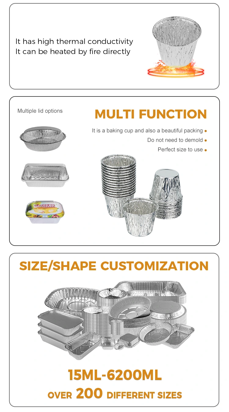 unchu 알루미늄 호일 공급 업체 일회용 베이킹 케이크 은색 알루미늄 호일 용기 식품 등급 알루미늄 호일 재료, 두꺼운 재료는 누출 방지 및 압축되어 대량 생산의 안정성을 보장합니다. 열 전도가 균일하고 빠르며 베이킹 시간이 단축되고 식사 전달 효율성이 향상됩니다. 통합 베이킹 및 포장 디자인은 탈형 및 플레이트 로딩 단계를 줄이고 인건비를 줄입니다. 다양한 사양이 가능하며 다양한 소형 디저트 생산에 적합하며 테이크아웃 운송 중에 쉽게 변형되지 않아 브랜드 평판을 높이는 데 도움이 됩니다.
