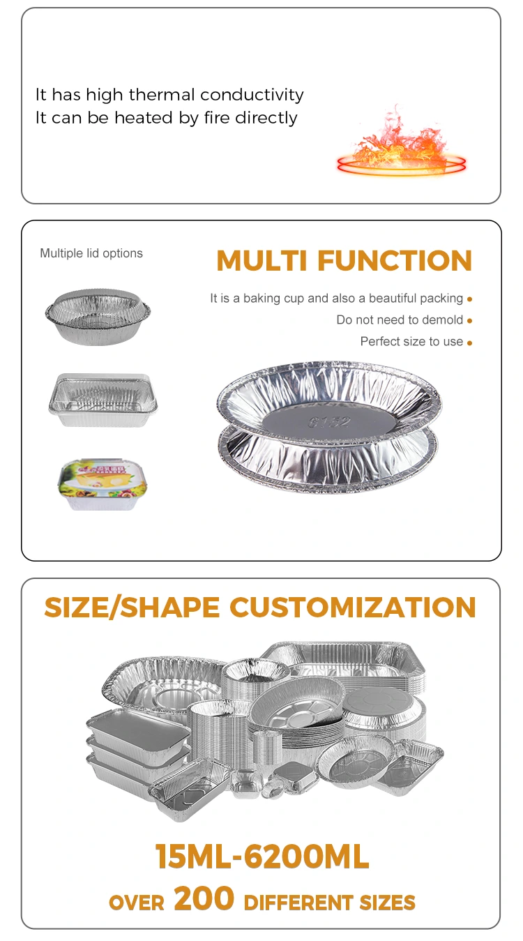 특징 : 일체형 성형은 두껍고 구운 내성, 식품 접촉 등급 알루미늄 호일 재료를 채택하고, 식품 접촉에 대한 안심, 변형이 쉬우 며, 누출이없고, 강한 두께, 부식성, 고온 저항성.