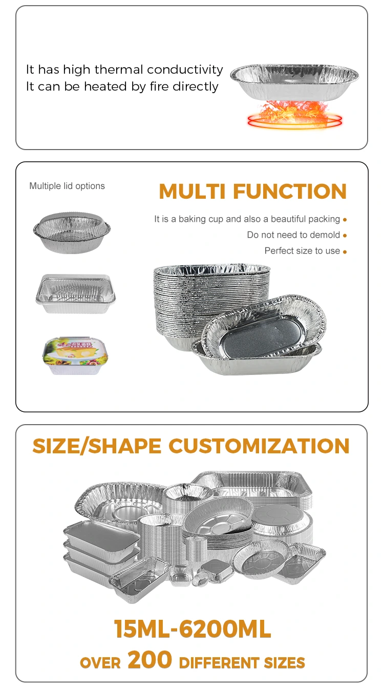 타원형 로스트 실버 알루미늄 호일 식품 용기 6005는 케이터링, 테이크 아웃 배달 플랫폼, 대형 연회, 뷔페 및 기타 행사에 적합하며 작은 케이크, 비스킷, 초콜릿, 소스 및 기타 음식을 담을 수 있습니다. 다양한 소스와 짝을 이루거나 구운 디저트를위한 장식물이든,이 소형 포일 박스는 요리에 큰 도움이됩니다. 가볍고 내구성이 뛰어난 컨테이너는 고품질 알루미늄 호일로 만들어졌으며 상단에 맞춤형 투명 애완 동물 뚜껑이 있고 바닥에는 고정 된 뚜껑이있어 음식이 베이킹 시트에 달라 붙지 않도록하여 운송 및 사용이 쉽습니다.