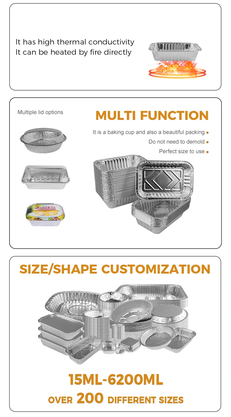 이 사각형 케이크 베이킹 실버 알루미늄 호일 컨테이너는 식품 등급 알루미늄 호일 재료로 만들어져 제품이 무취이며 식품 안전 표준을 완전히 준수하도록합니다.