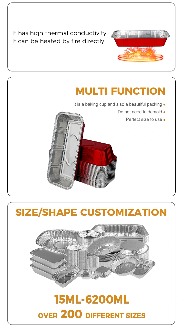 Yunchu 알루미늄 호일은 내구성과 내열성을 갖도록 설계된 고품질 직사각형 빨간색 베이커리 케이터링 실버 알루미늄 호일 용기를 제공하며, 열을 균일하게 전도하여 탄화를 방지하고 강력한 밀봉 기능을 갖추고 있어 신선함을 유지합니다.