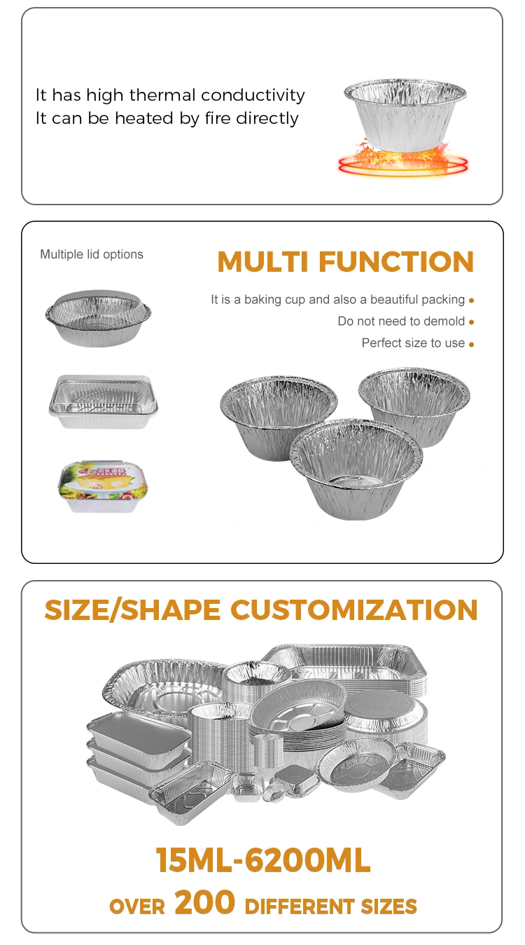 둘째, 베이킹 중에 둥근 베이크 케이크은 알루미늄 호일 식품 용기 용기가 탁월합니다. 열전도율이 우수하며 베이킹 중에 열을 균일하게 분배하여 과열 또는 타격 바닥을 피할 수 있습니다. 동시에, 그 안정성은 또한 매우 우수하여 고온 환경에서도 구조적 안정성을 유지하고 쉽게 변형되지 않습니다.