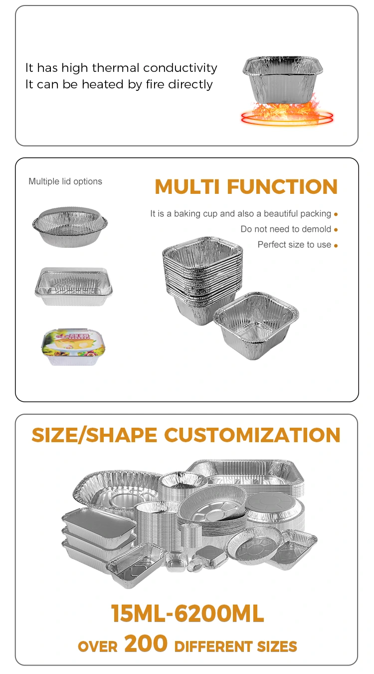 Yunchu 알루미늄 포일 공급 업체가 제공하는 광장 베이킹 팬 에어 프라이어은 포일 용기는 에어 프라이어, 작은 베이킹 오븐, 케이터링 테이크 아웃 및 카페테리아 등 다양한 경우에 적합합니다. 굴 베르 미첼 리, 디저트 붉은 콩, 구운 닭 날개 및 찐 케이크를 만드는 데 적합 할뿐만 아니라 다양한 재료와 짝을 이룰 수 있으며 케이터링 산업의 모든 측면에서 널리 사용됩니다. 컨테이너는 스틱 및 스틱 방지 디자인을 특징으로하며 오목하고 볼록한 바닥 구조가있어 음식이 곰팡이를 더 쉽게 방출하고 더 나은 외관을 유지할 수 있습니다. 열린 화염 위로 굽거나 찐하든, 제한되지 않고 쉽게 처리 할 수 ​​있습니다. 그 재료는 견고하고 내구성이 뛰어나 오븐과 에어 프라이어뿐만 아니라 편리하고 빠른 열린 불꽃 그릴 또는 증기선에도 사용하기에 적합합니다. 또한 컨테이너 표면은 매끄럽고 평평하며 가장자리가 둥글고 손을 긁기 쉽지 않으며 주름이 있더라도 그립에 영향을 미치지 않습니다. 우리는 다양한 요구를 충족시키기 위해 정사각형, 둥근 및 하트 모양의 스타일을 포함한 다양한 팬 모양을 제공합니다. 관심이 있으시면 자세한 내용은 고객 서비스 직원에게 문의하십시오.