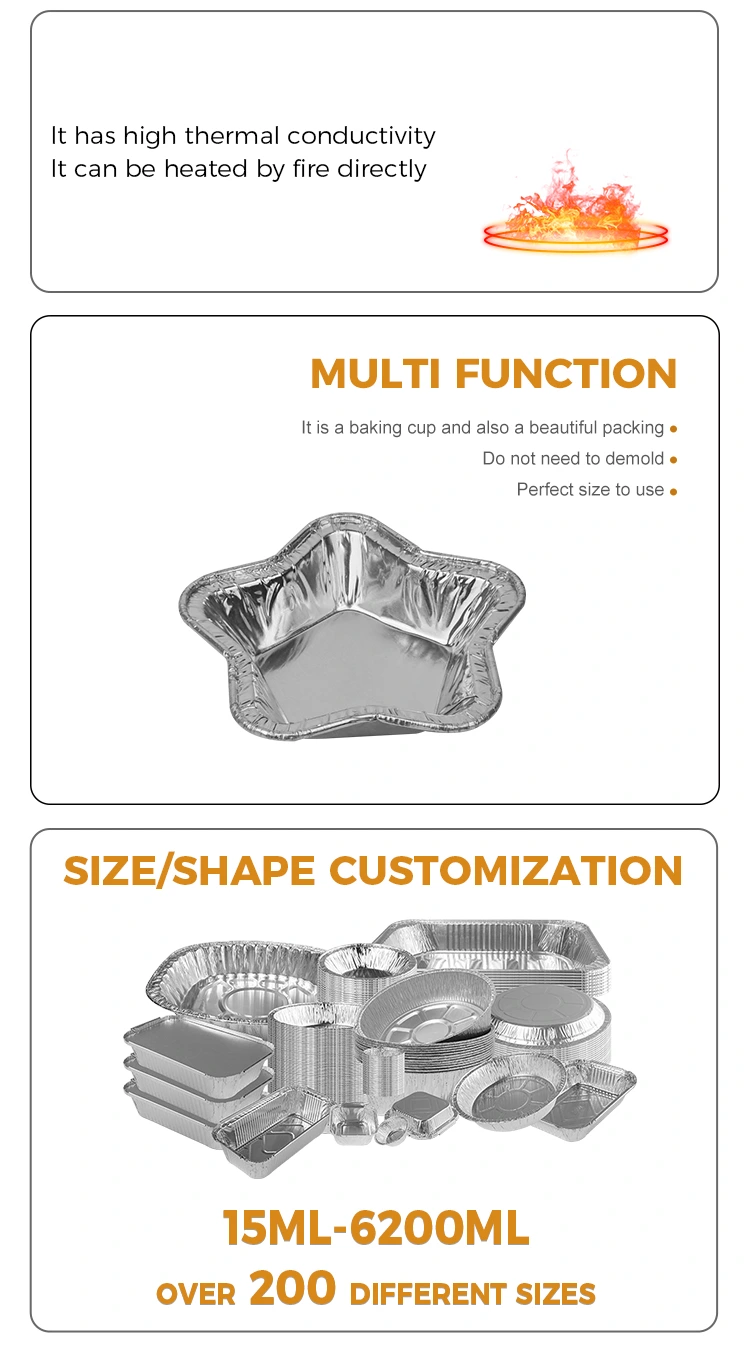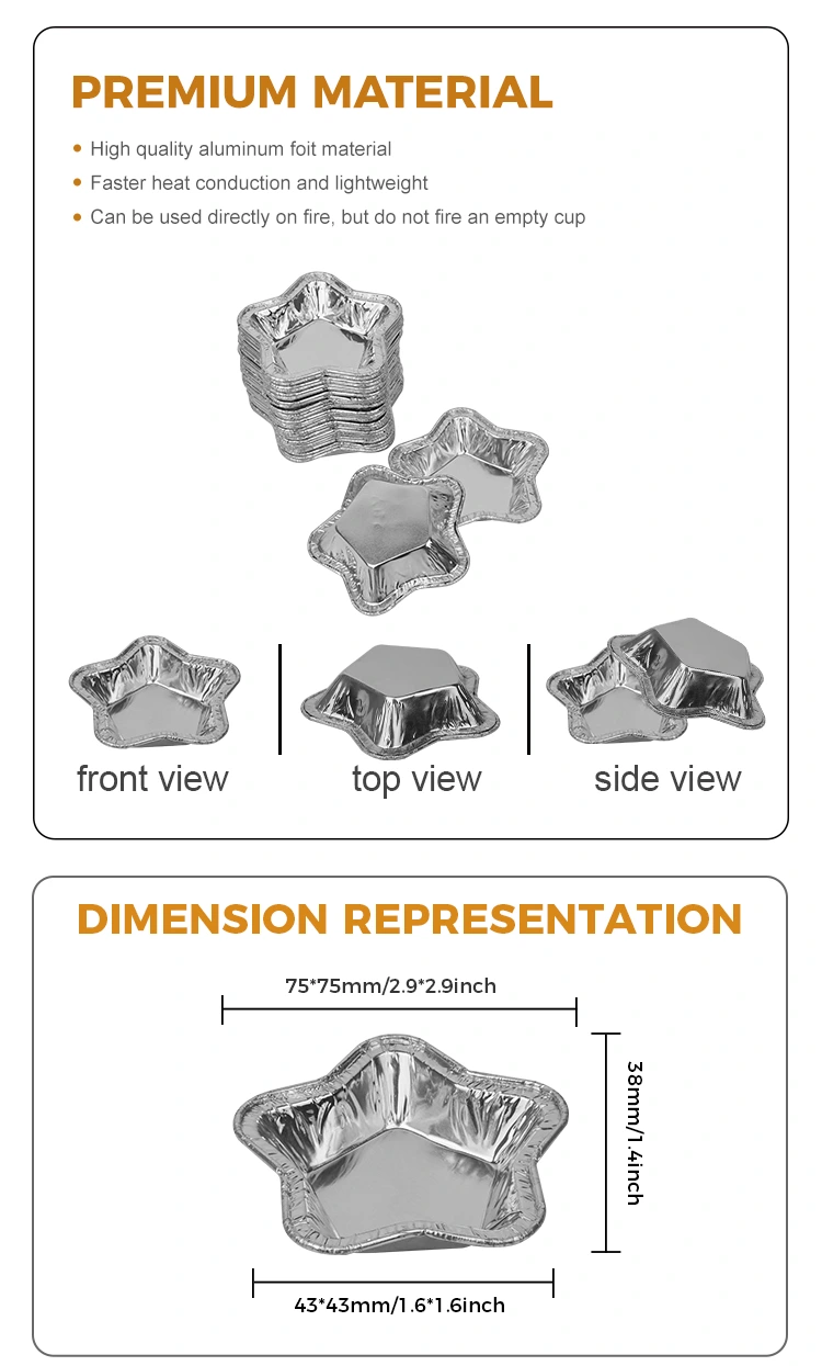 Yunchu 알루미늄 호일 공급업체 베이킹용 알루미늄 호일 타르트 컵 알루미늄 호일 식품 용기는 고품질 베이킹 은색 알루미늄 호일 용기입니다. 이 제품은 타르트나 작은 음식을 만들 때 설거지, 기름 찌꺼기 등의 문제를 실용적이고 효과적으로 해결합니다. 별모양 알루미늄호일 식품용기 베이킹용 알루미늄호일 타르트 컵 바닥의 내벽과 외벽은 매끄럽게 디자인되어 베이킹 후 들러붙는 현상을 방지하고 바닥이 타는 것을 방지합니다.